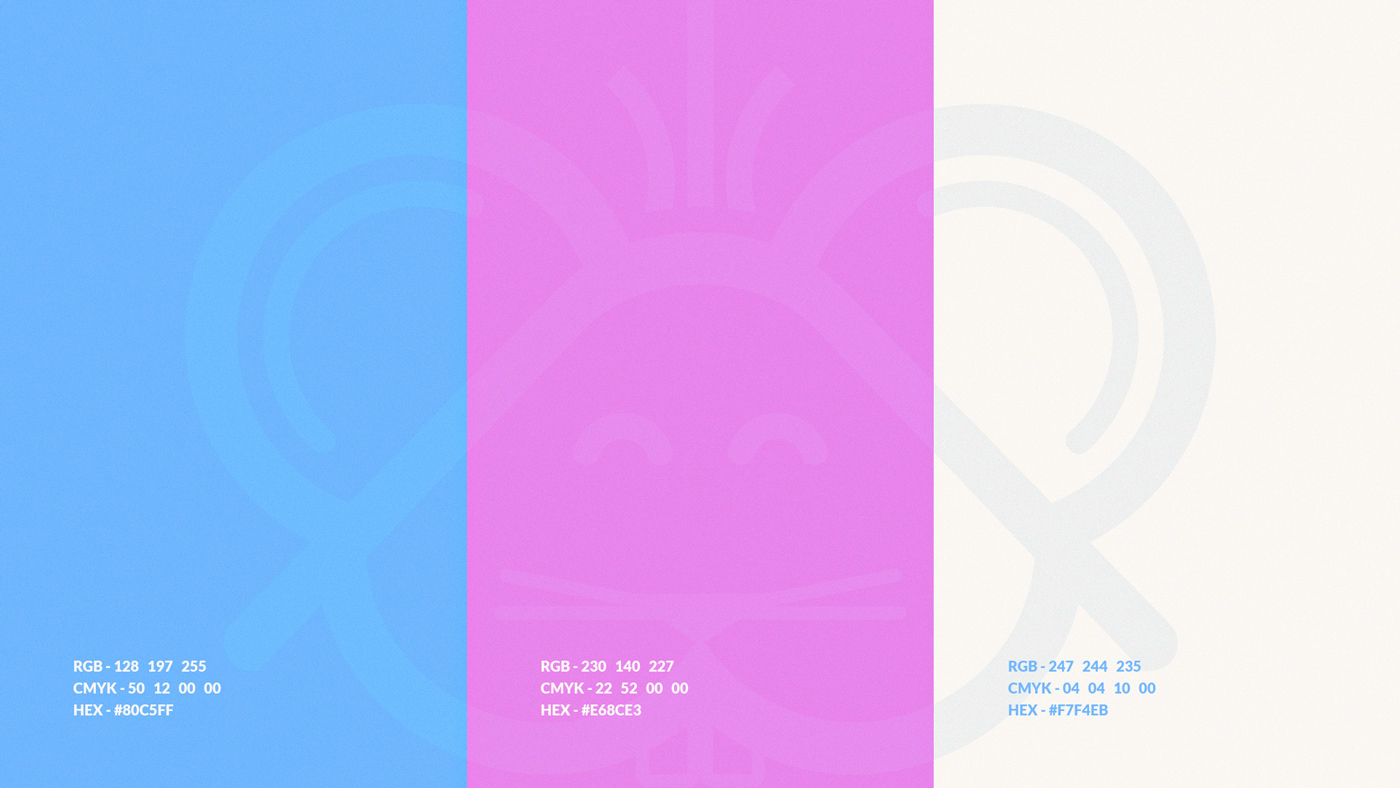 A paleta de cores escolhida contém 3 cores com base em tons pastéis. Cores delicadas como rosa e azul formam uma combinação que transmite delicadeza e confiança, e o amarelo como cor de contraste transmitindo otimismo e clareza.